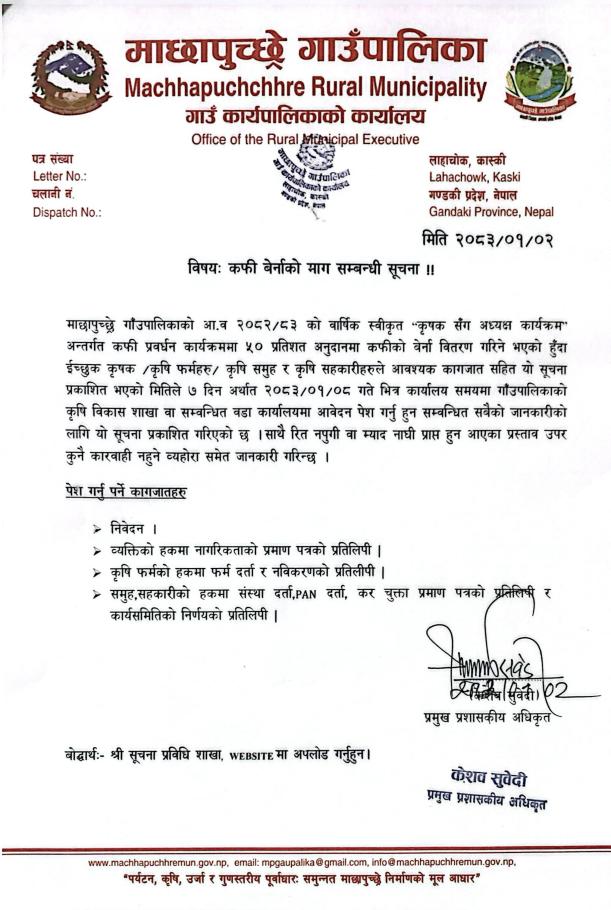 कफि बेर्नाको माग सम्बन्धी सूचना ।