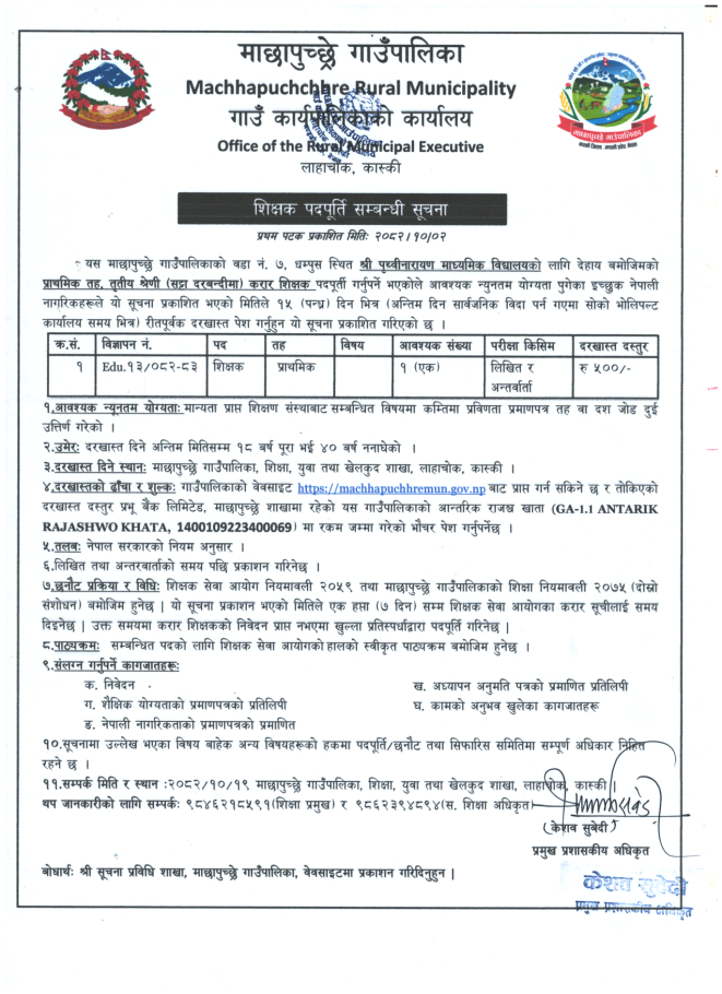 » शिक्षक पदपूर्ति सम्बन्धी सूचना ।( श्री पृथ्वीनारायण माध्यमिक विद्यालय)