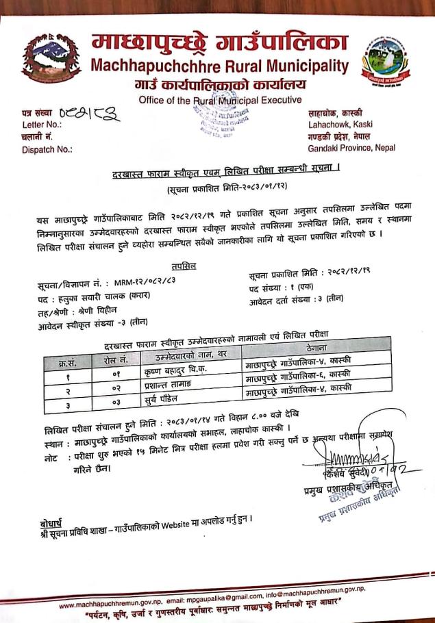 (हलुका सवारी चालक)दरखास्त फाराम स्वीकृत एवम् लिखित परीक्षा सम्बन्धी सूचना ।