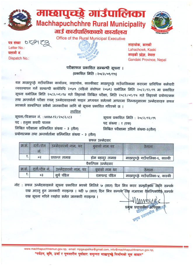 ( हलुका सवारी चालक) परीक्षाफल प्रकाशित सम्बन्धी सूचना ।