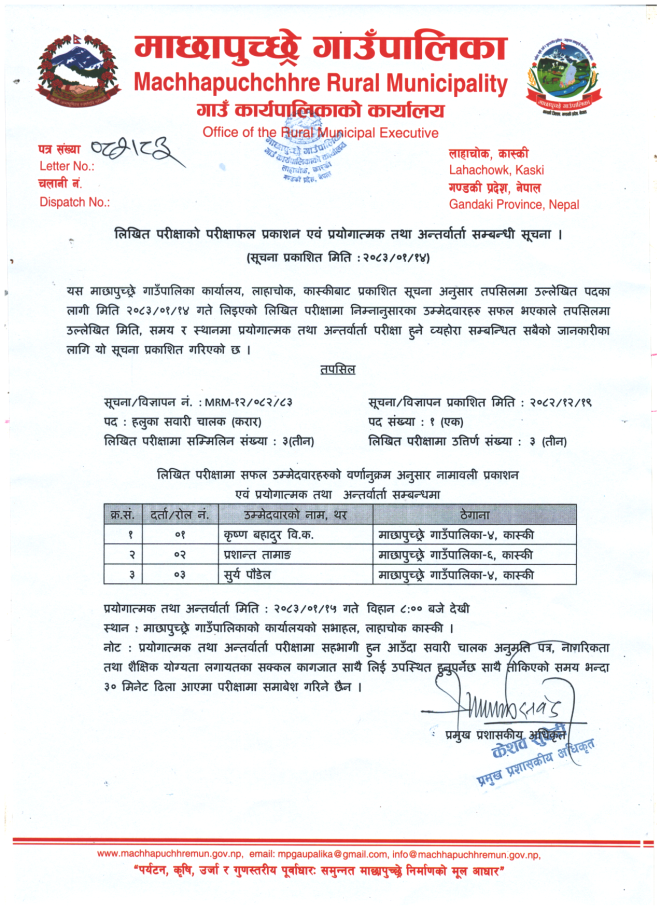 » (हलुका सवारी चालक) लिखित परीक्षाको परीक्षाफल प्रकाशन एवं अन्तर्वाता सम्बन्धी सूचना ।