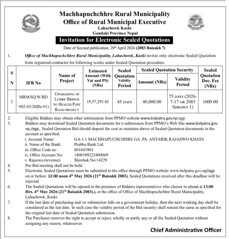 आ.व २०८२/८३ को लागि निर्धारण गरिएको माछापुच्छ्रे गाउँपालिकाको दररेट