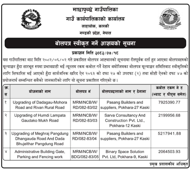 » बोलपत्र स्वीकृत गर्ने आशयको सूचना ।