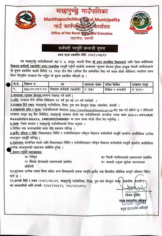 कर्मचारी पदपूर्ति सम्बन्धी सूचना (श्री बाराही आधारभूत विद्यालय)