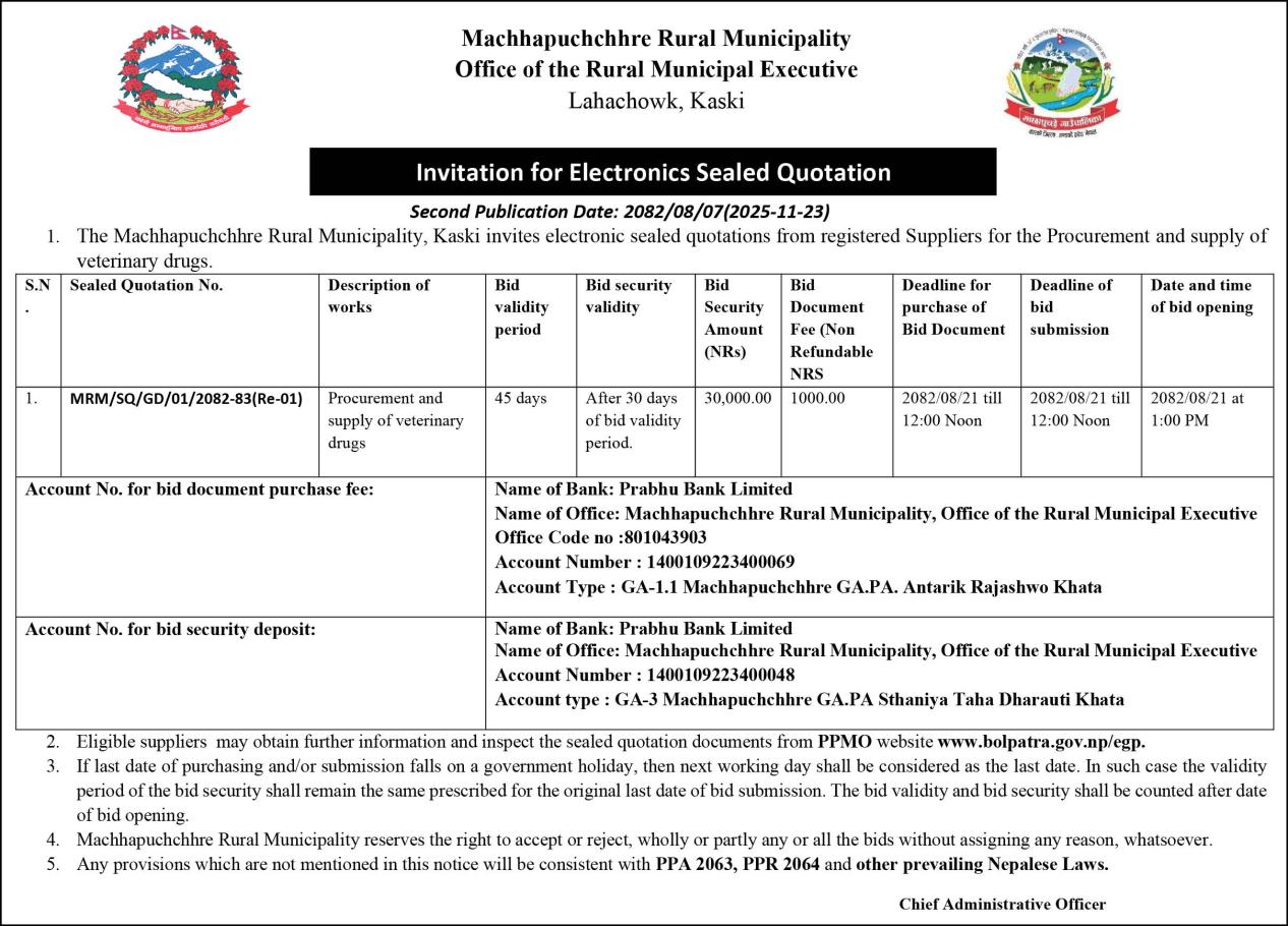 माछापुच्छ्रे गाउँपालिका अन्तर्गतका साधारण निर्माणमुखी नदीजन्य पदार्थ उत्खनन,ब्यवस्थापनका कार्यमा मेशीनरी उपकरण प्रयोग तथा नियमन सम्बन्धी कार्यविधि २०८०
