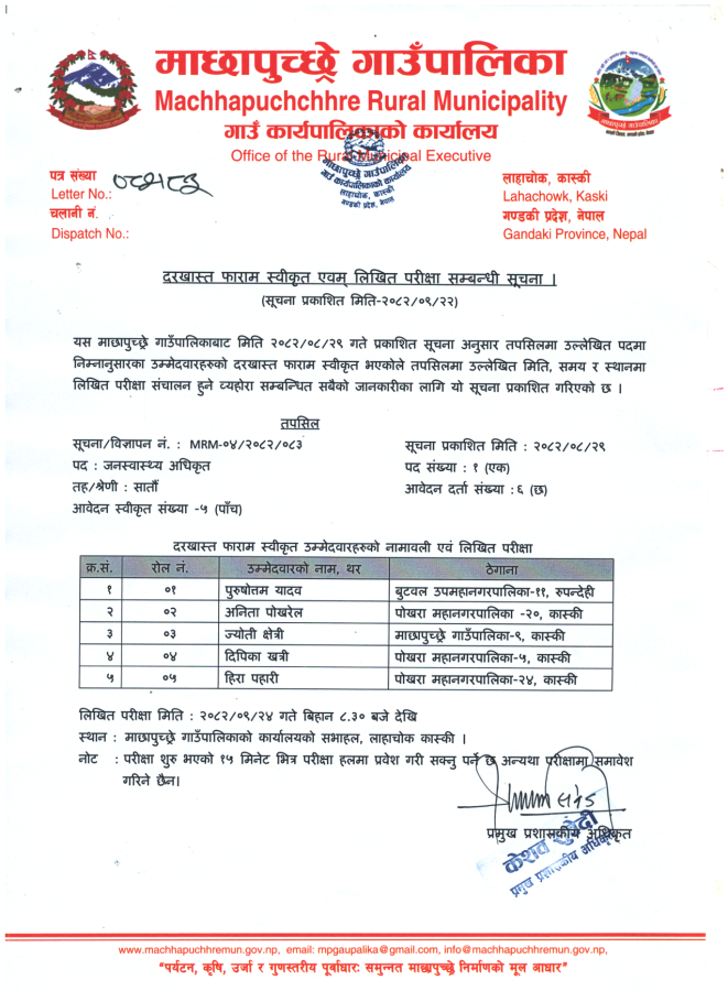 » (जनस्वास्थ्य अधिकृत) दरखास्त फाराम स्वीकृत एवम् लिखित परीक्षा सम्बन्धी सूचना ।
