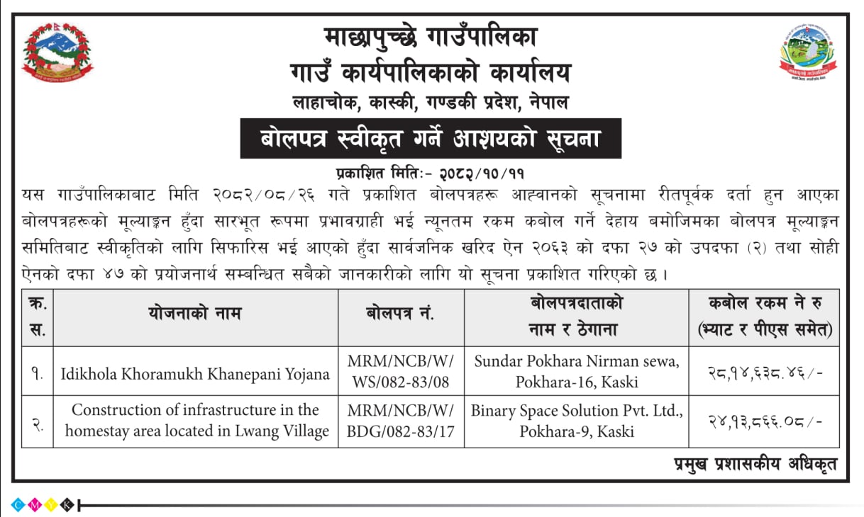 » बोलपत्र स्वीकृत गर्ने आशयको सूचना