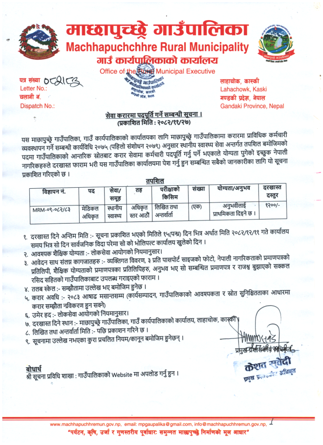 (मेडीकल अधिकृत)सेवा करारमा पदपूर्ति गर्ने सम्बन्धी सूचना ।