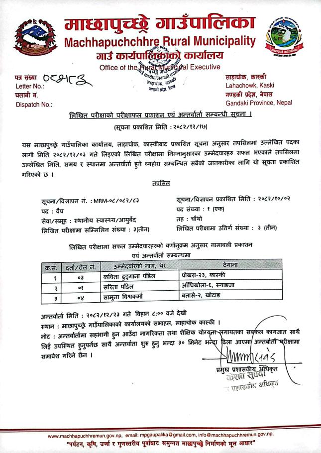 » (वैद्य) लिखित परीक्षाको परीक्षाफल प्रकाशन एवं अन्तर्वाता सम्बन्धी सूचना ।