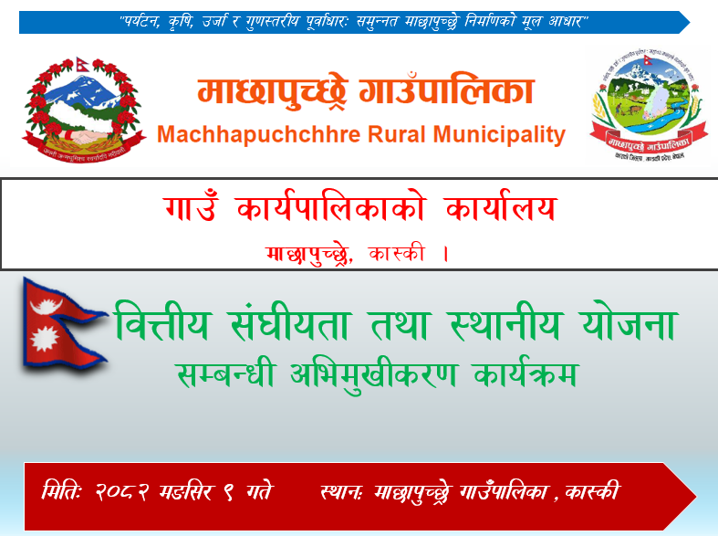 मिति २०७९ पौष १२ र १३ गते माछापुच्छ्रे गाउँपालिकाद्वारा गाउँपालिकाका जनप्रतिनिधी एवम् शाखा प्रमुखहरुका लागि आयोजित स्थानीय सरकार सञ्चालन, गाउँसभा सञ्चालन र कानुन निर्माण प्रक्रिया सम्बन्धी २ दिने सिकाई अभ्यास तालिम कार्यक्रम संघीयतामा स्थानीय सरकार, स्थानीय सभा सञ्चालन, स्थानीय तहमा कानून निर्माण प्रक्रिया र प्रयोग, सभा सञ्चालनको अभ्यास, सभामा रहने विभिन्न समितिहरु र तिनका भुमिका र स्थानीय सरकार सञ्चालनका विविध पक्षहरुमा सहभागीहरुलाई सैद्धान्तिक एवम् प्रयोगात्मक रुपमा छलफल एवम् अभ्यास गराई सम्पन्न ।
