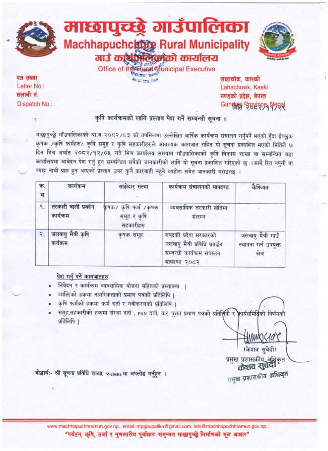 » कृषि कार्यक्रमको लागि प्रस्ताव पेश गर्ने सम्बन्धी सूचना ।