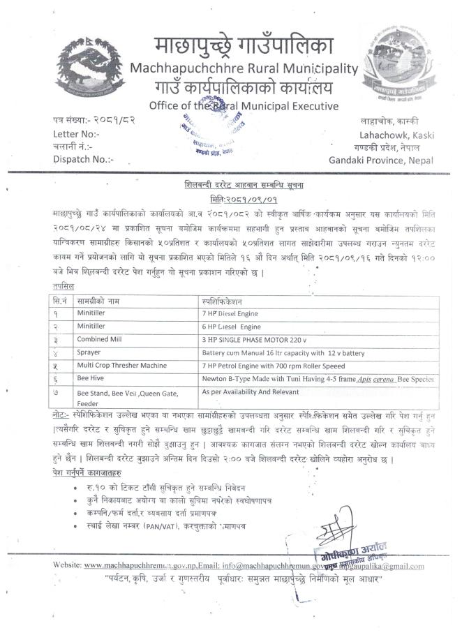 आ व २०८१।०८२ को लागि निर्धारण गरिएको माछापुच्छ्रे गाउँपालिकाको दररेट