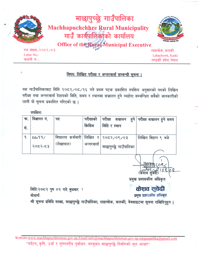 लिखित परीक्षा र अन्तरवार्ता सम्बन्धी सूचना ।