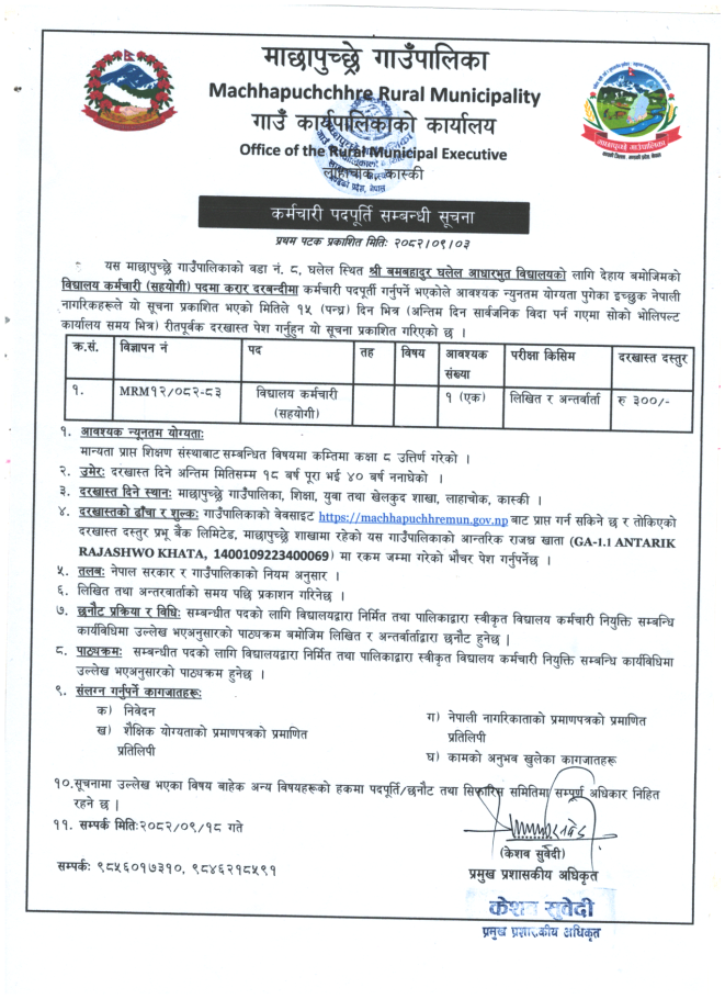 » विद्यालय कर्मचारी (सहयोगी) सेवा करारमा पदपूर्ति गर्ने सम्बन्धी सूचना