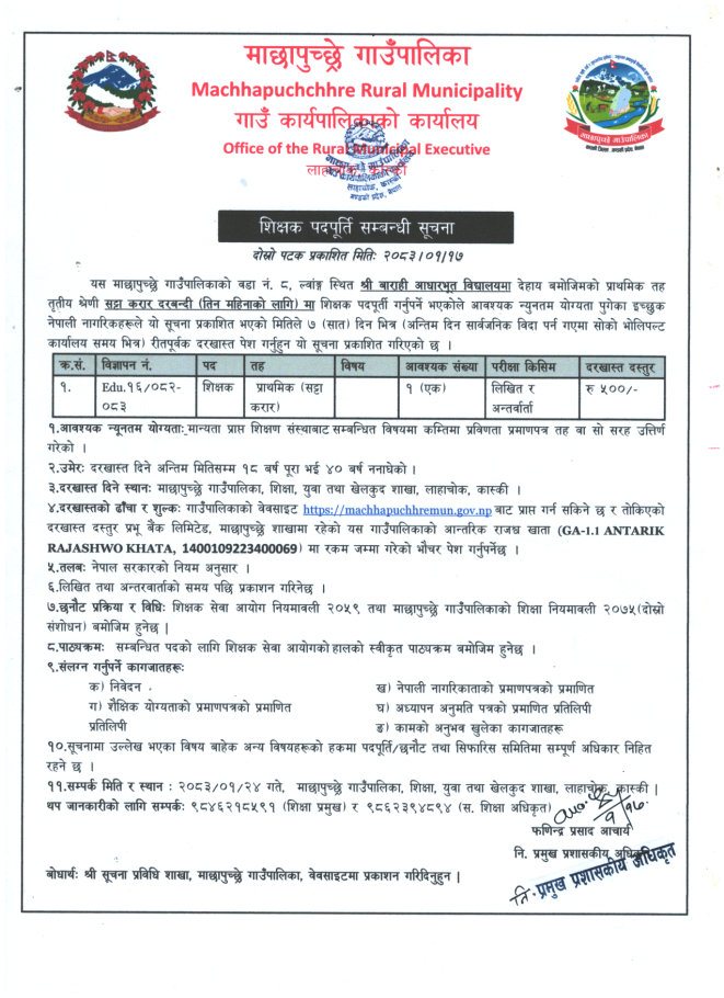 शिक्षक पदपूर्ति सम्बन्धी सूचना ।( श्री बाराही आधारभूत विद्यालय/ प्राथमिक तह)