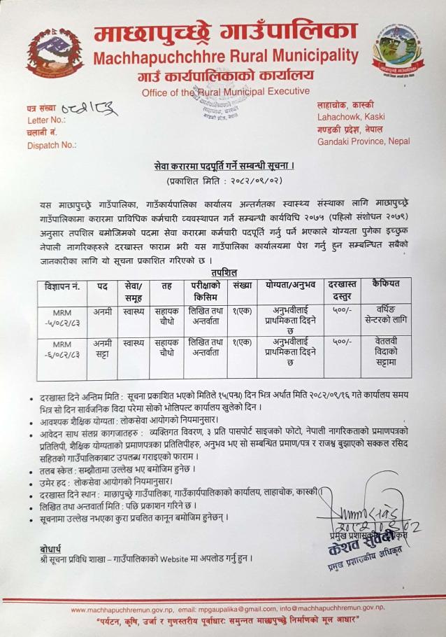 » सेवा करारमा पदपूर्ति गर्ने सम्बन्धी सूचना (सहायक चौथो अनमी)।
