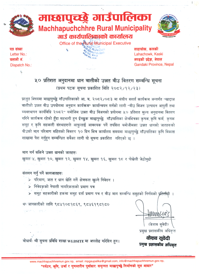 ५० प्रतिशत अनुदानमा धान बालीको उन्नत बीउ वितरण सम्बन्धि सूचना ।