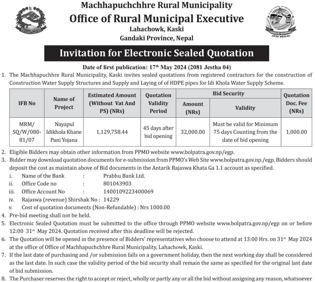 आ व २०८१।०८२ को लागि निर्धारण गरिएको माछापुच्छ्रे गाउँपालिकाको दररेट