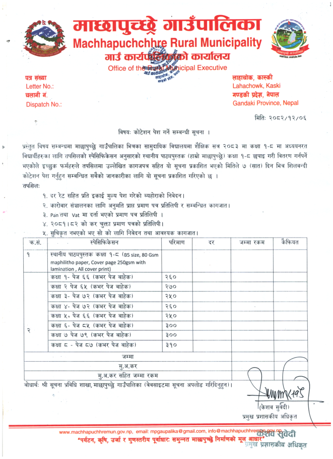 आ.व २०८२/८३ को लागि निर्धारण गरिएको माछापुच्छ्रे गाउँपालिकाको दररेट