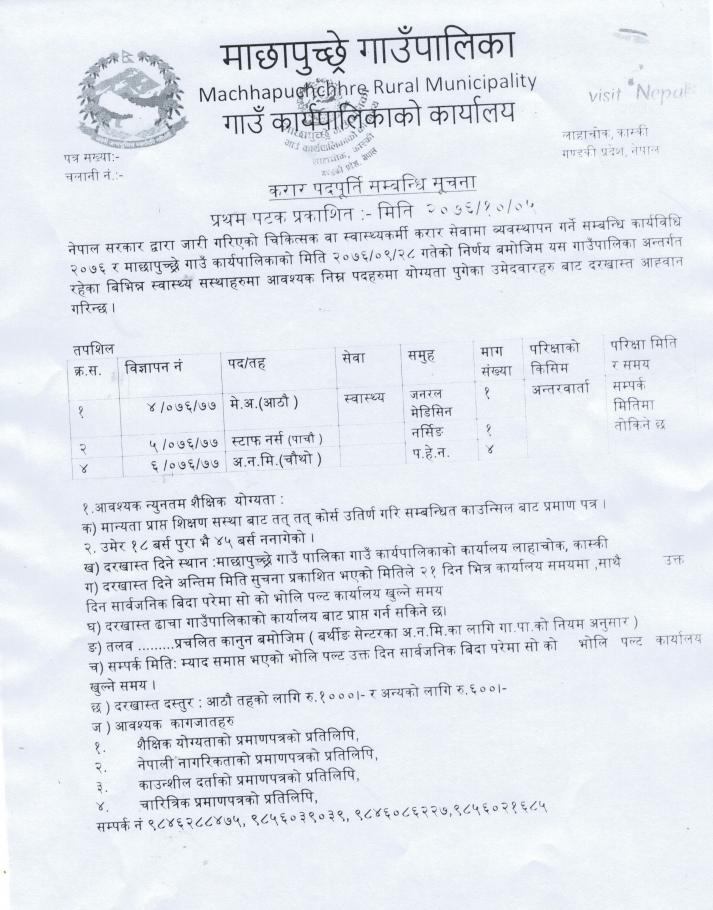 मे.अ (आठौं), स्टाफ नर्स (पाँचौं) र अ.न.मि (चौंथो) पदको लागि करार पदपूर्ति सम्बन्धि सूचना।
