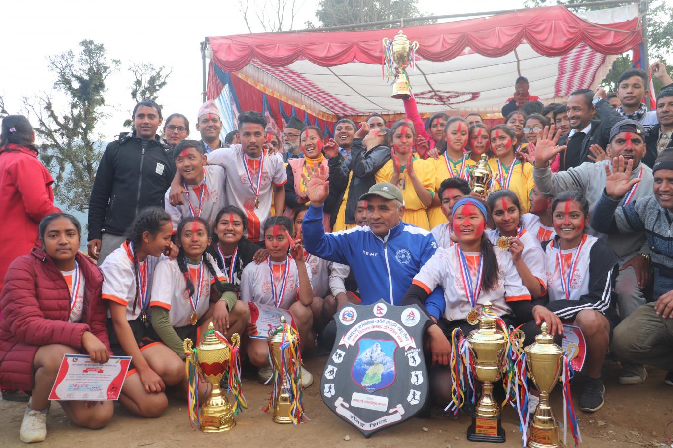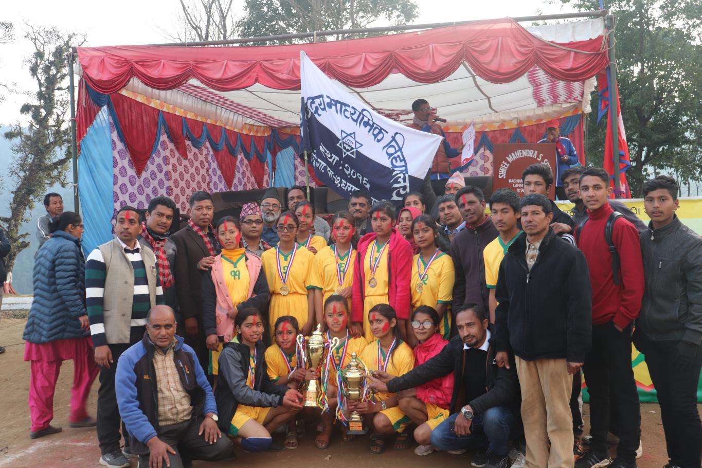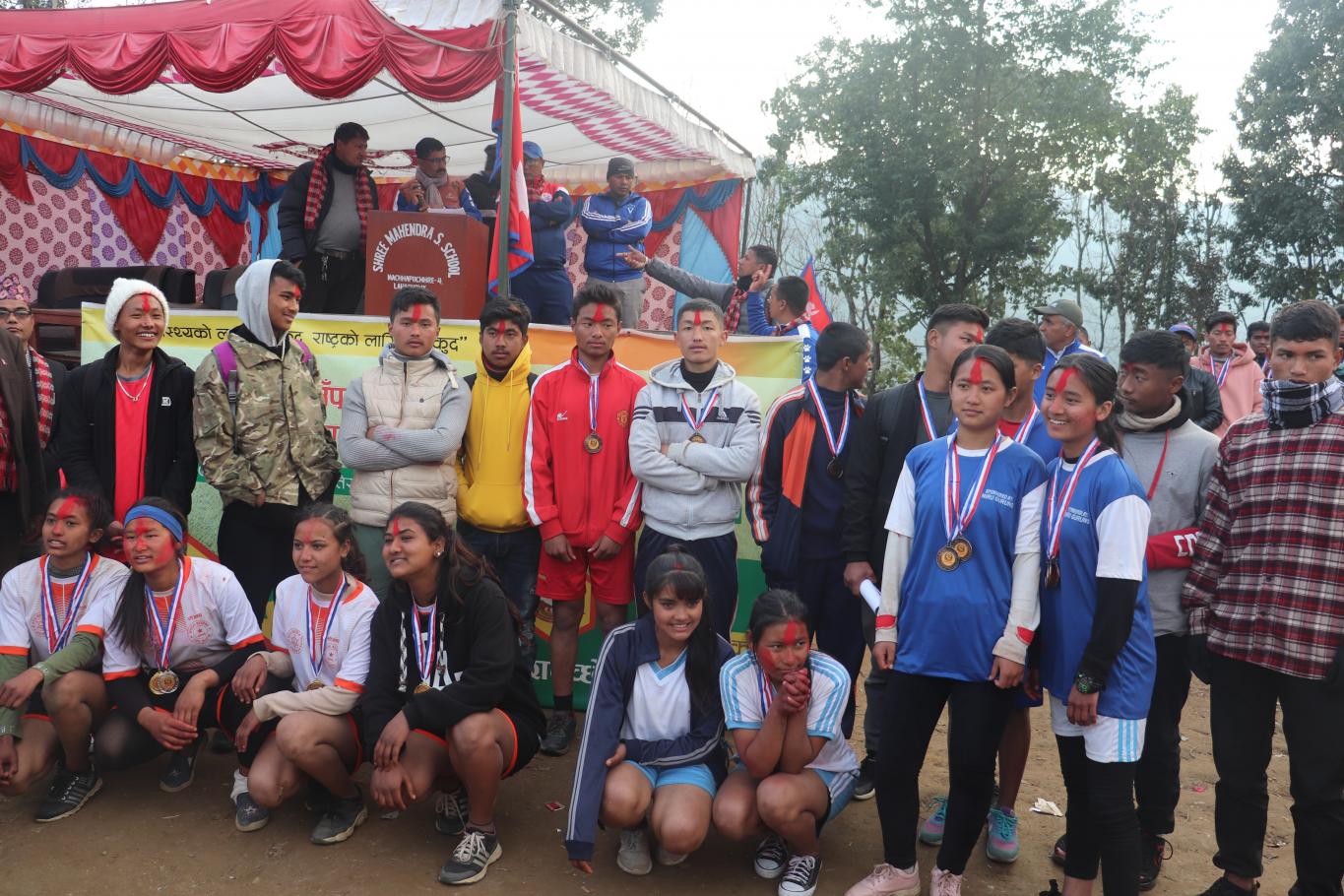 “स्वास्थका लागि खेलकुद राष्ट्रका लागि खेलकुद” भन्ने मुल नाराका साथ आयोजना गरिएको राष्ट्रपति रनिङ शिल्ड अन्तर विद्यालय स्तरीय खेलकूद प्रतियोगिता २०७६ आज सम्पन्न भएको छ। तीन दिन सम्म चलेको खेलकूद प्रतियोगितामा ७ स्वर्ण, ७ रजत र ५ कास्य सहित महेन्द्र मा.वि समग्रमा प्रथम, ७ स्वर्ण, २ रजत र ५ कास्य सहित उदय मा.वि द्वितीय यसैगरी ६ स्वर्ण, ६ रजत र ३ कास्य सहित शारदा मा.वि तृतीय हुन सफल भए। आज सम्पन्न भलिबल छात्रतर्फ शारदा मावि प्रथम, गौरीशङ्कर मावि द्वितीय र माछापुच्छ्रे मावि तृतीय स्थान हसिल गर्न सफल भए भने छात्रातर्फ बराह मावि प्रथम, निष्पक्ष मावि द्वितीय र माछापुच्छ्रे माविले तेस्रो स्थान हासिल गरे। यसैगरी कवड्डी छात्रतर्फ शारदा मा.वि प्रथम, गौरी शंकर मा.वि द्वितीय र माछापुच्छ्रे मा.विले तेस्रो स्थान हासिल गरे भने छात्रातर्फ महेन्द्र मा.वि प्रथम, शारदा मा.वि, द्वितीय र माछापुच्छ्रे मा.विले तेस्रो स्थान हासिल गर्न सफल भए। महेन्द्र मा.विले समग्र प्रतियोगितामा प्रथम भए संगै लगातार दोस्रो पटक उपधि जित्न सफल भएको छ।
