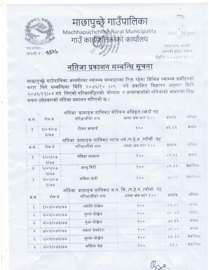 » मेडिकल अधिकृत (आठौं), स्टाफ नर्स (पाँचौ) र अ.न.मि (चौंथो) पदको नतिजा प्रकाशन सम्बन्धि सूचना