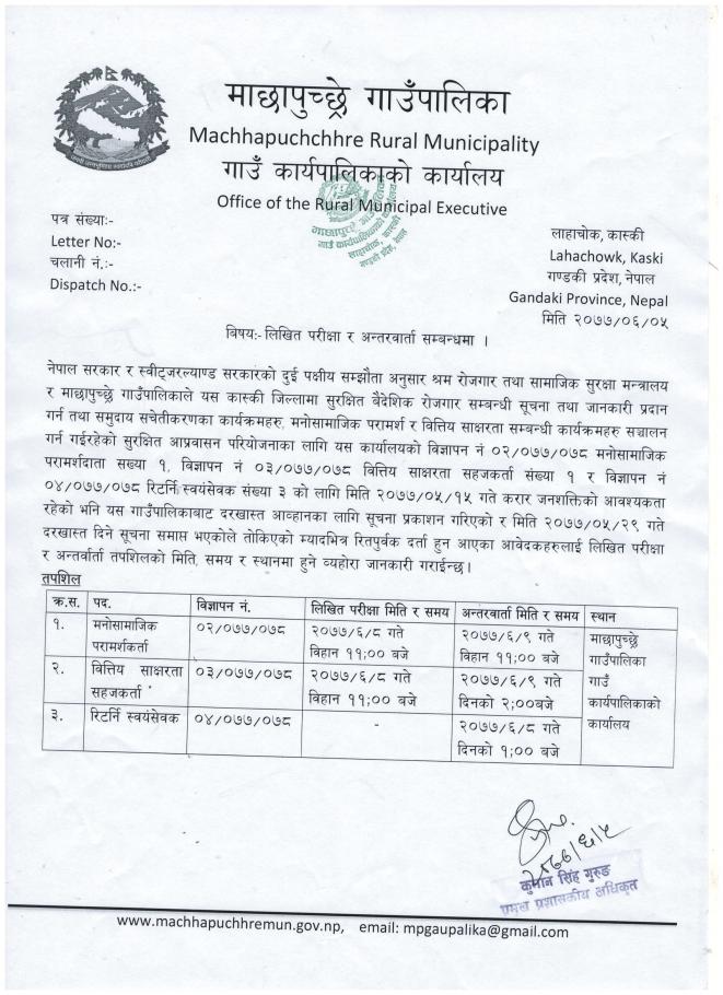 मनोसामाजिक परामर्शकर्ता, वित्तिय साक्षरता सहजकर्ता र रिटर्नि स्वयंसेवक पदको लिखित परीक्षा र अन्तरवार्ता सम्बन्धी सूचना।