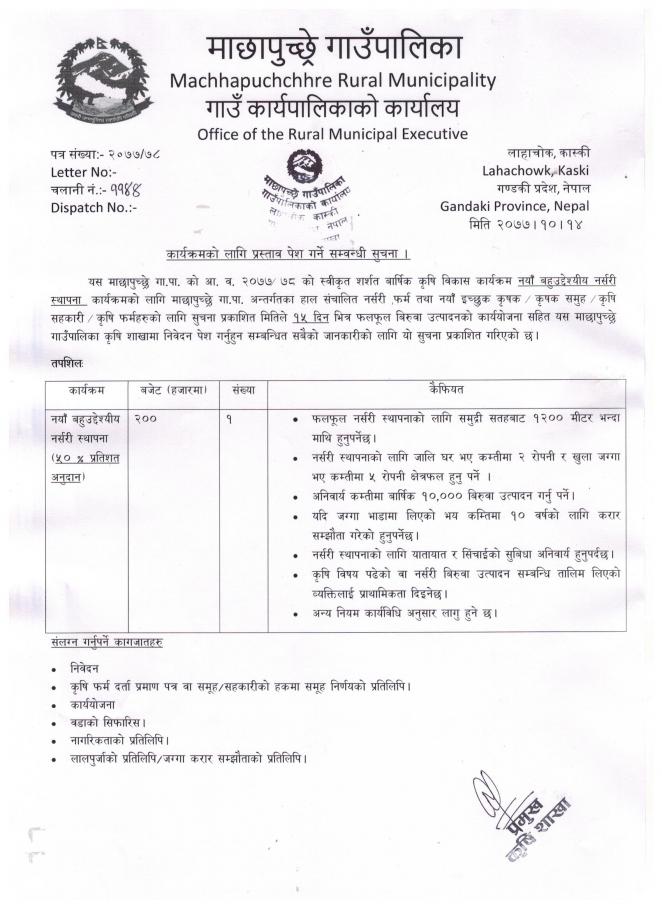 » बहुउद्देश्यीय नर्सरी स्थापना कार्यक्रमको लागि प्रस्ताव पेश गर्ने सम्बन्धी सूचना।