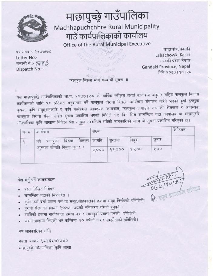 फलफुल बिरुवा माग सम्बन्धी सूचना।