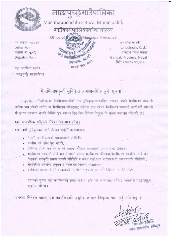 मेलमिलापकर्ता सूचिकृत/अद्यावधिक हुने सम्बन्धमा।
