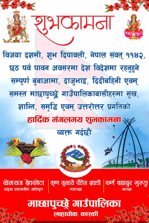 » नेपालीहरुको महान् पर्व विजया दशमी, शुभ दिपावली, नेपाल संवत् ११४२, छठ पर्वको पावन अवसरमा हार्दिक मंगलमय शुभकामना व्यक्त गर्दछौं।